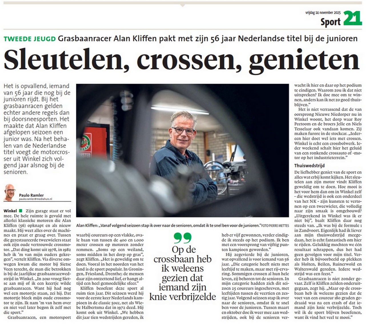 (Bijna) iedereen die zich met een motorsport bezig houdt is ooit begonnen met een brommer. Zo ook ons lid Alan Kliffen, na jaren van andere bezigheden heeft Alan het grasbaanracen herontdekt. In het Noord Hollands Dagblad van 14 november 2025 is een artikel van zijn prestaties geplaatst.